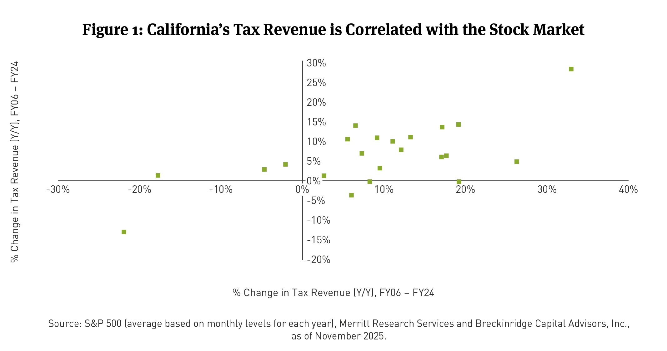 The State of California’s tax structure is notoriously volatile, as it is highly correlated with asset prices. Going back to 2006, a 10 percent change in the level of the S&P 500 is associated with a 4 percent change in state tax revenue (See Figure 1). This math suggests that an AI-driven 40 percent decline in stock prices could result in a 16 percent drop in tax revenue. Should tax revenues see a significant adjustment, California’s fiscal status could be challenged, given its high cost of living and already elevated tax burden relative to peers.3