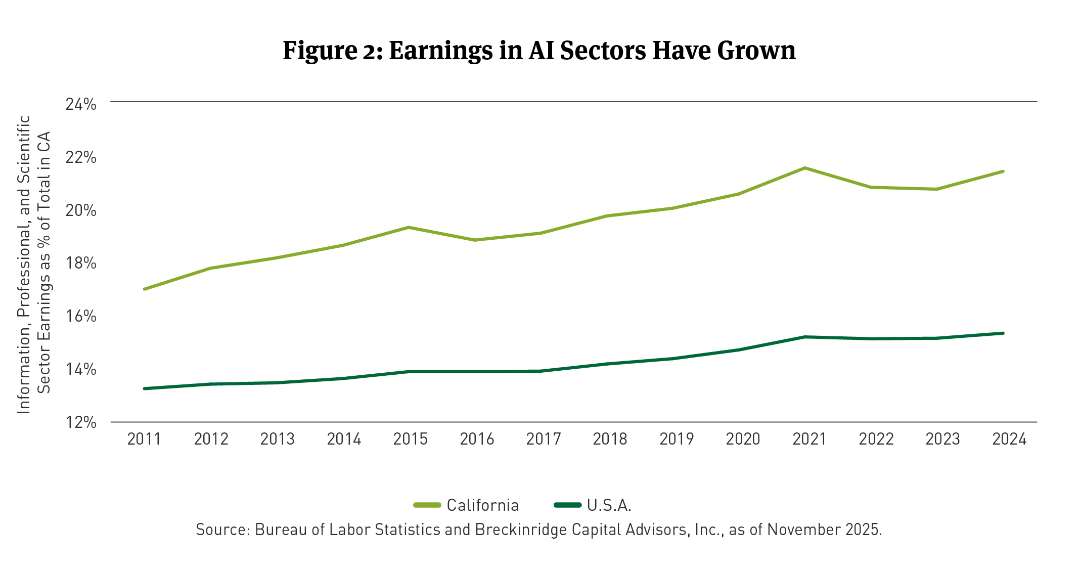 California’s income tax base may also be more correlated with the fate of AI than it was a few years ago given the state’s employment profile. AI employment is largely captured in the Information and Professional/Scientific sectors, per the Bureau of Labor Statistics. Payroll earnings from these sectors increased from 17 percent to over 21 percent of the California total (See Figure 2).