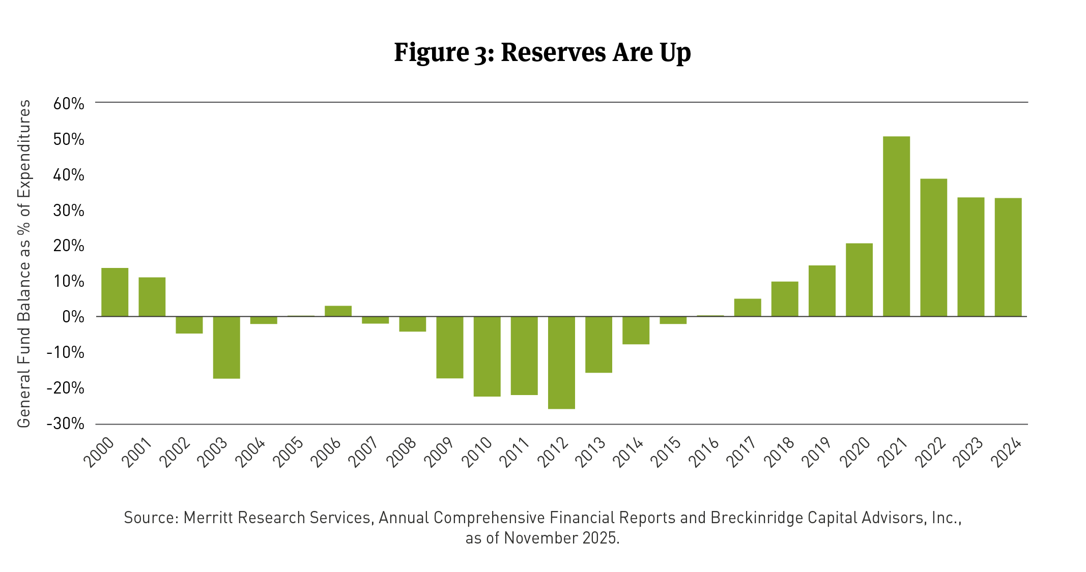- California's fiscal resilience is supported by a historically strong general fund reserve position.