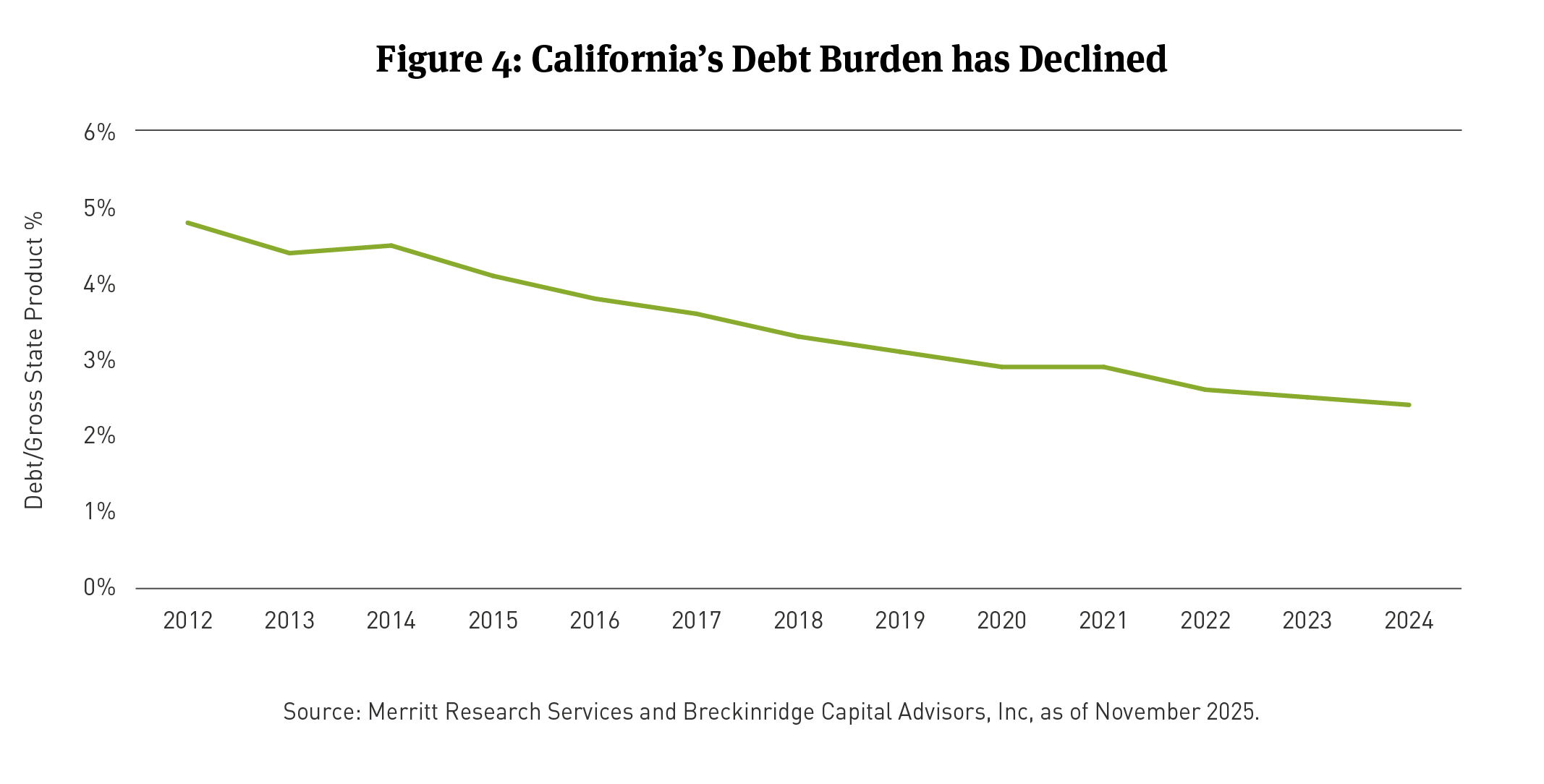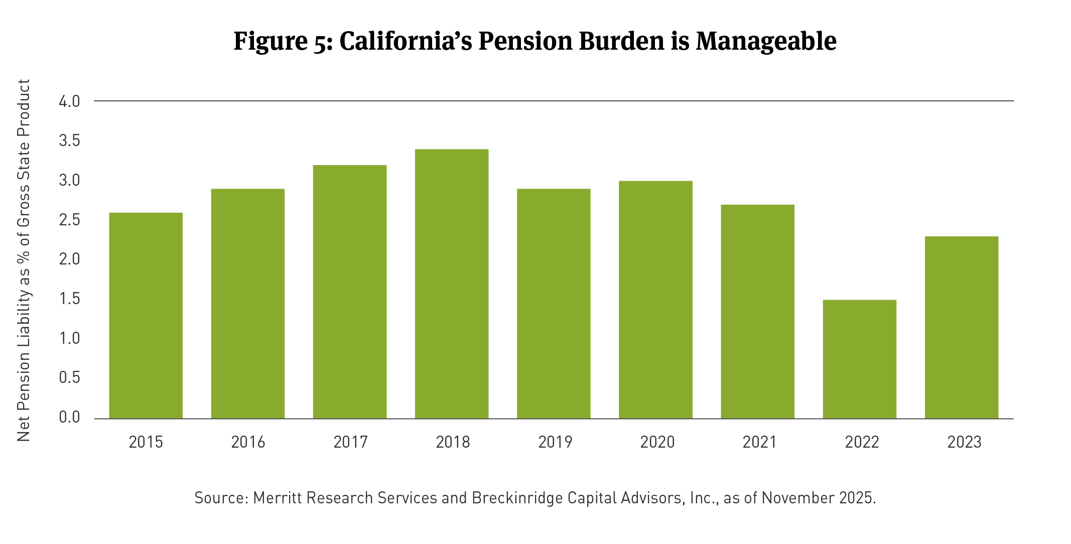 3. California’s pension funding stability also improved. The state’s net pension liability has declined from 3.4 percent of GSP in 2017 to 2.3 percent in the most recent year (See Figure 5). In the event of a large correction in equities markets, contributions into each fund will rise, but they will do so on a smoothed basis, meaning they will be amortized and paid from the budget over a period of years.12 Annual contributions for pension and retiree healthcare obligations were 4 percent of all-funds expenditures in FY24.13