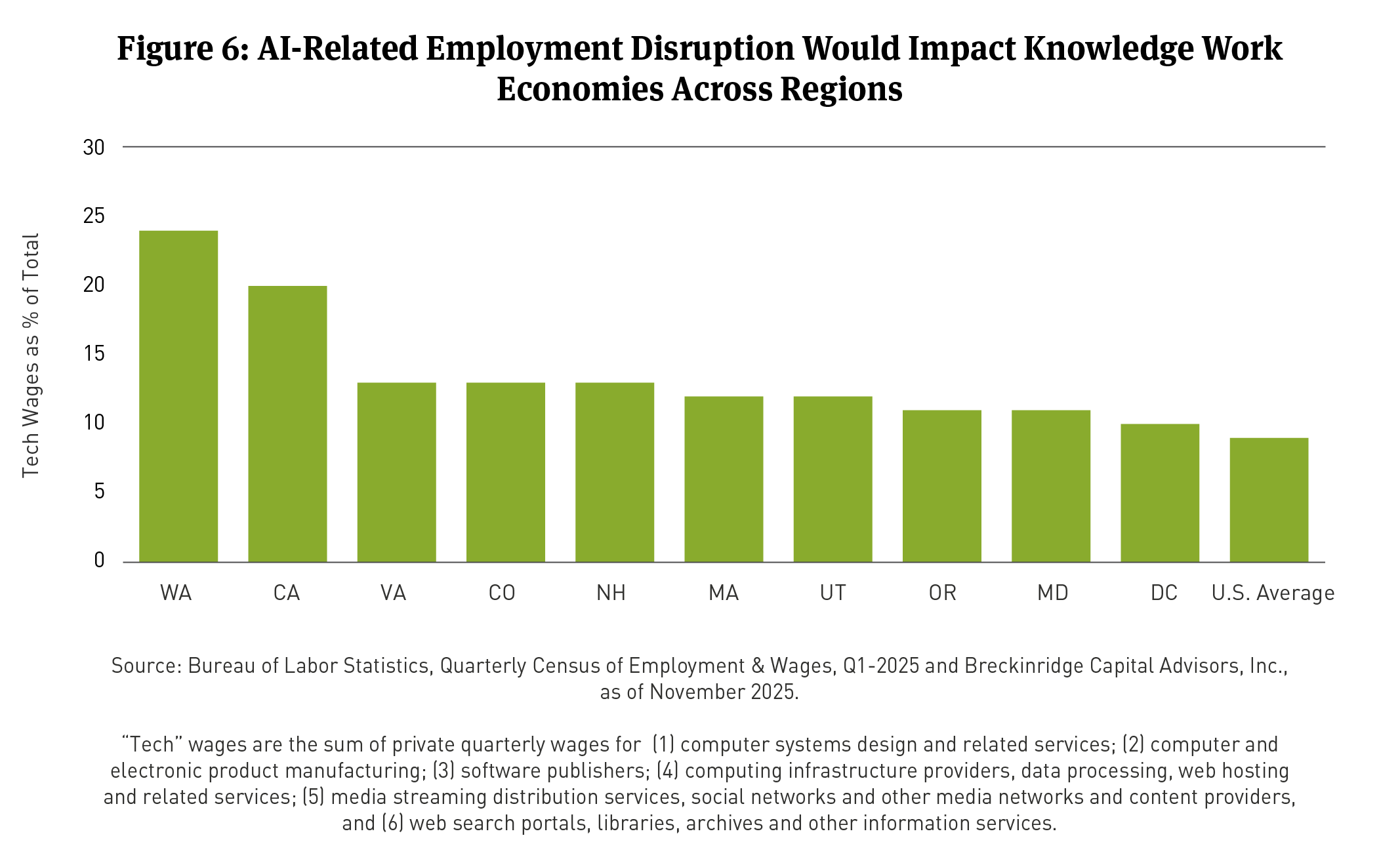 3. Local governments with exposure to tech layoffs. The AI transition may lead to significant net job losses in affluent knowledge-work regions. There are signs this is already happening in the tech sector, as AI replaces some software jobs. In addition to California, the states of Washington, Virginia, Colorado, New Hampshire and Massachusetts have meaningful exposure to AI-related employment disruption (See Figure 6). In our view, each of these states is, like California, reasonably well positioned to manage through such a transition. But specific localities within these states are likely to be more exposed, especially given that states typically reduce local aid in recessions.
