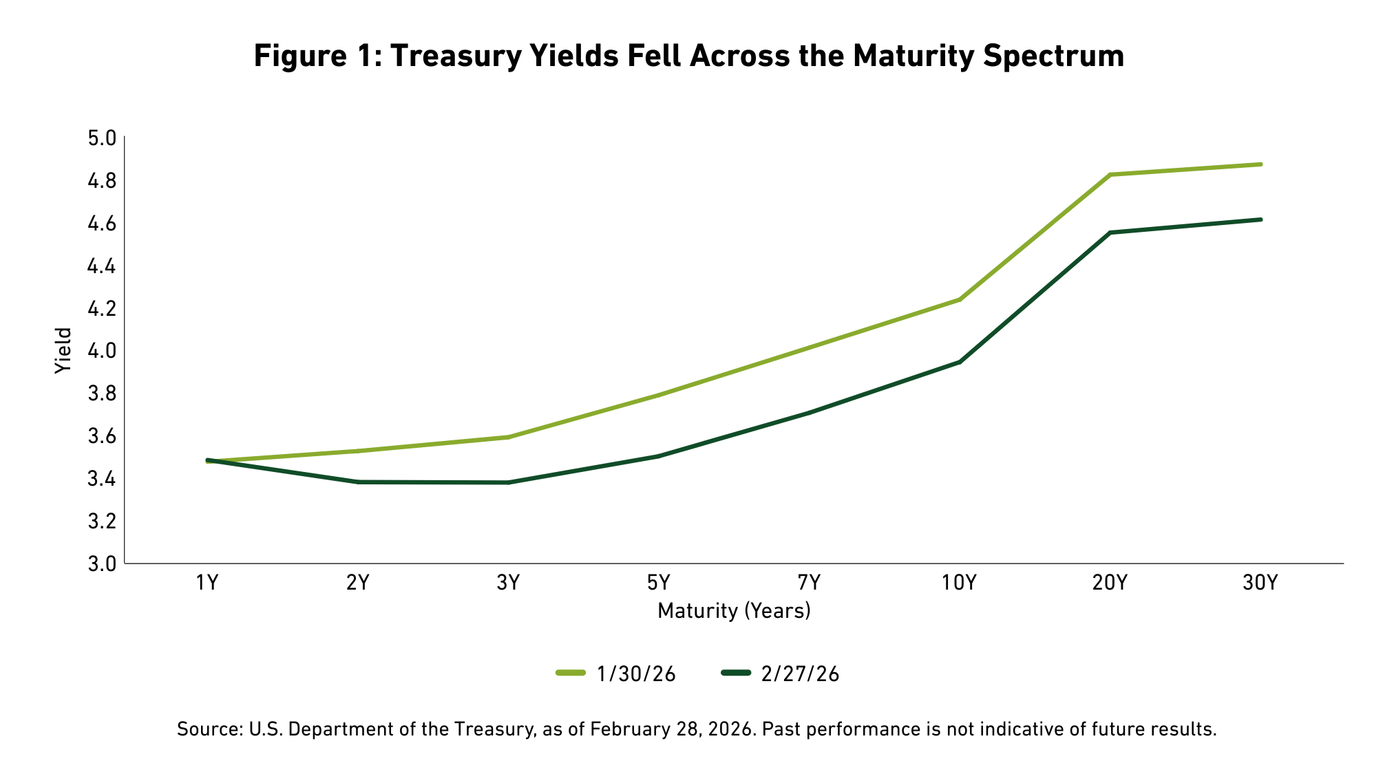 - U.S. Treasury Curve: Treasury yields fell across the curve, and the 10-year yield declined 30 basis points (bps), as buyers turned to Treasuries amidst potential signs of the disinflationary power of AI, rising geopolitical tensions and worries about private credit.