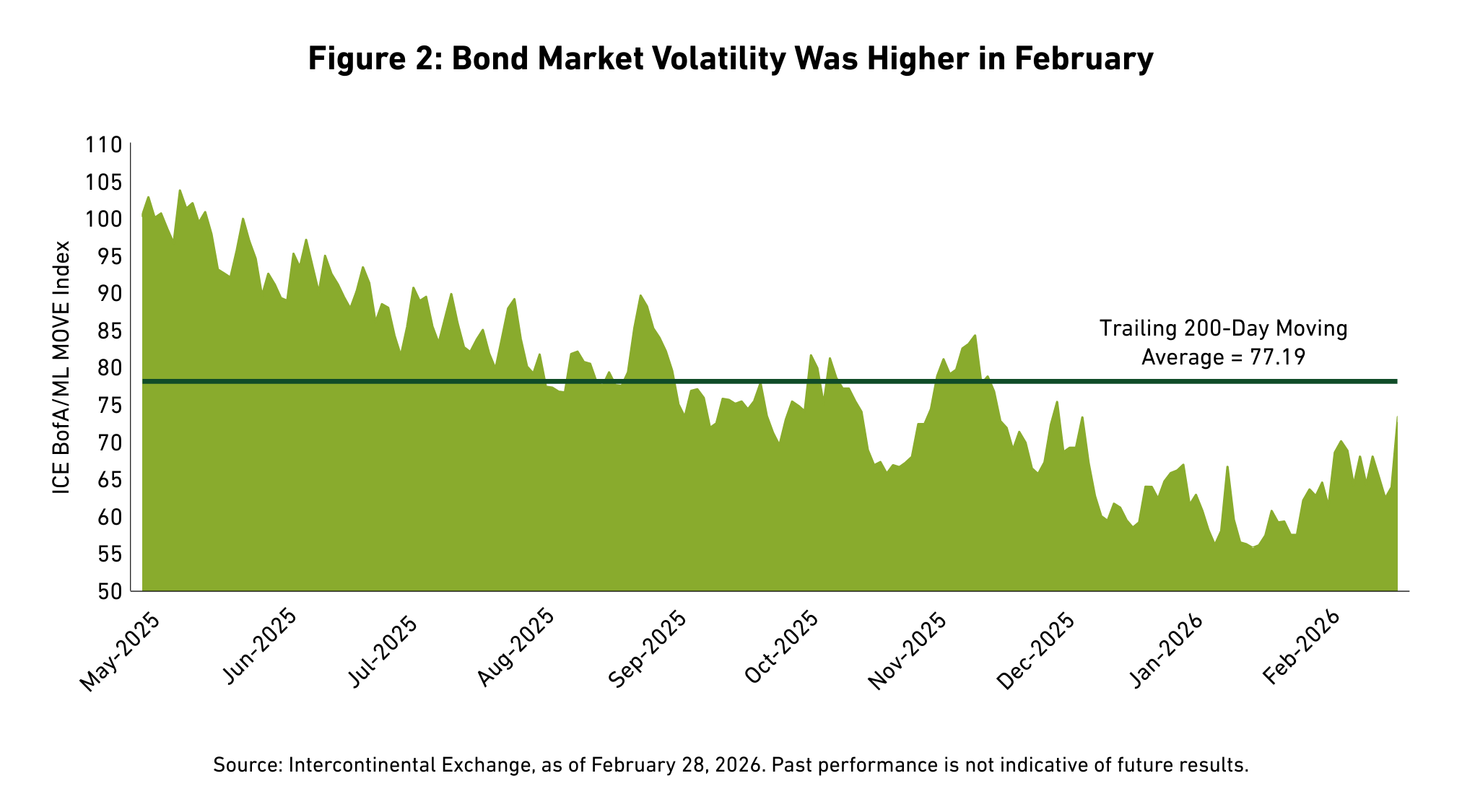 Bond market volatility, as measured by the ICE Bank of America/Merrill Lynch Option Volatility Estimate (MOVE) Index,4 moved higher during February, touching levels not seen since December. After receding somewhat later in the month, volatility spiked once again at month end.