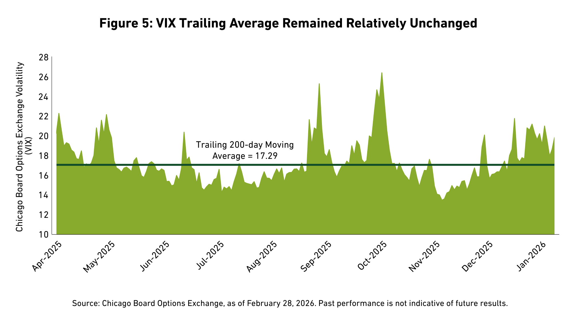 The S&P 500 Index retreated 0.76 percent in February, as investors rotated away from mega-cap technology and companies that may be impacted by AI related disruption and into sectors that face low obsolescence risk. Volatility picked up in February, with the Chicago Board Options Exchange (CBOE) Volatility Index (VIX) ending the month near 20, above the trailing 200-day average of 17.29 (See Figure 5).