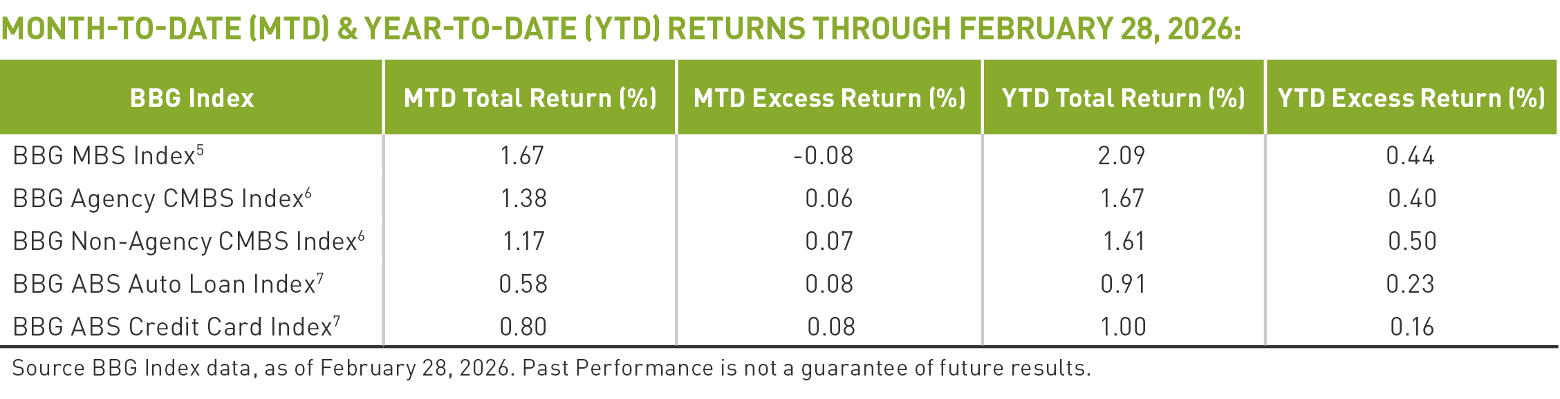 Securitized assets delivered positive total returns in February, though excess returns remained muted. BBG reported that MBS earned 1.67 percent, while excess returns were slightly negative at -0.08 percent. Agency MBS spreads widened by 5bps, though the "belly" of the coupon stack—specifically 3s and 4s—outperformed the rest of the sector. Within the broader sector, Commercial MBS (CMBS) returned 1.28 percent, with Agency and Non-Agency CMBS posting returns of 1.38 percent and 1.17 percent, respectively.