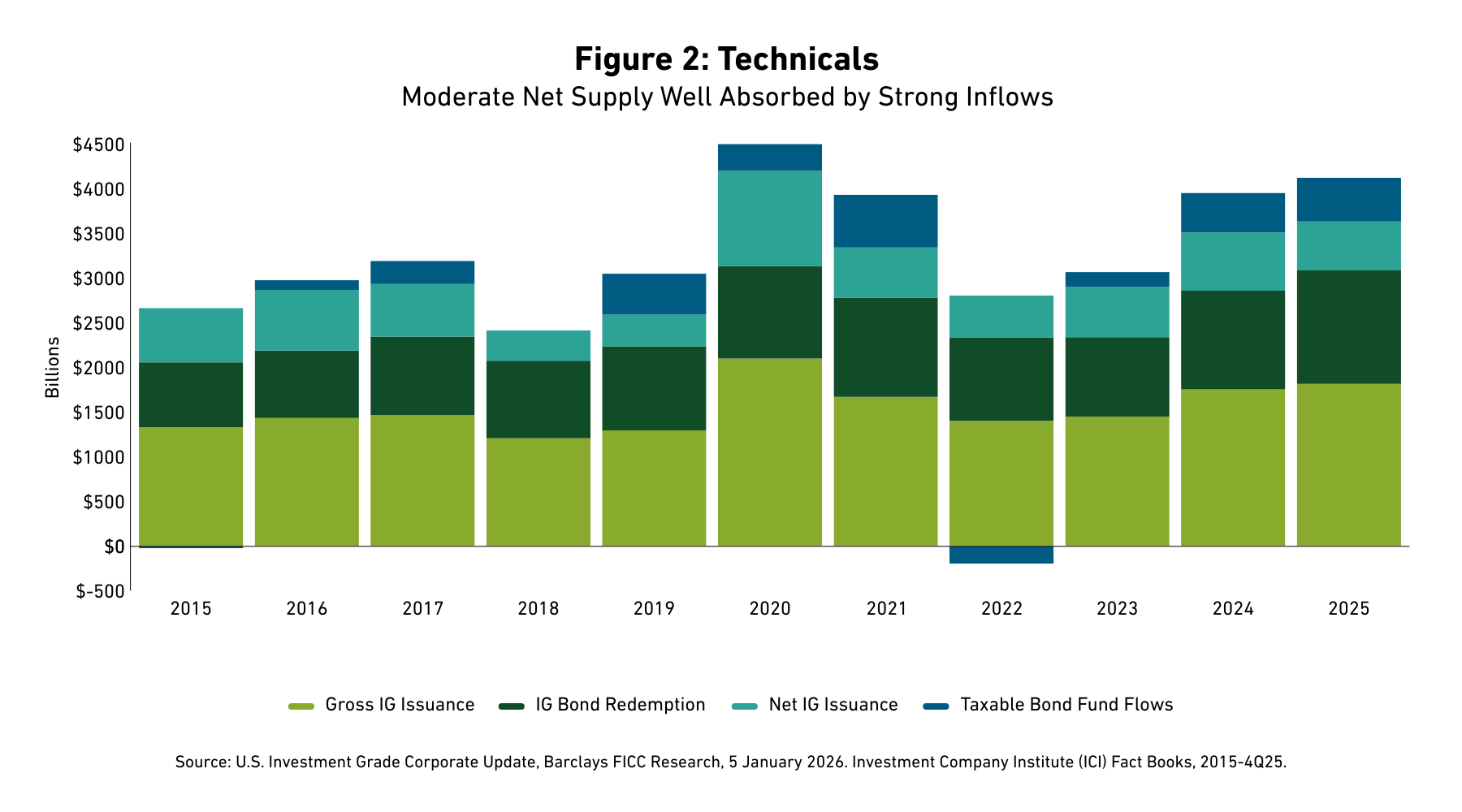 Entering 2026, we think bond supply may accelerate on rising cap ex and M&A activity. IG gross bond supply was $321 billion in the fourth quarter, and $1.82 trillion in 2025. On a net basis, after redemptions, issuance was $86 billion and $548 billion, respectively.17