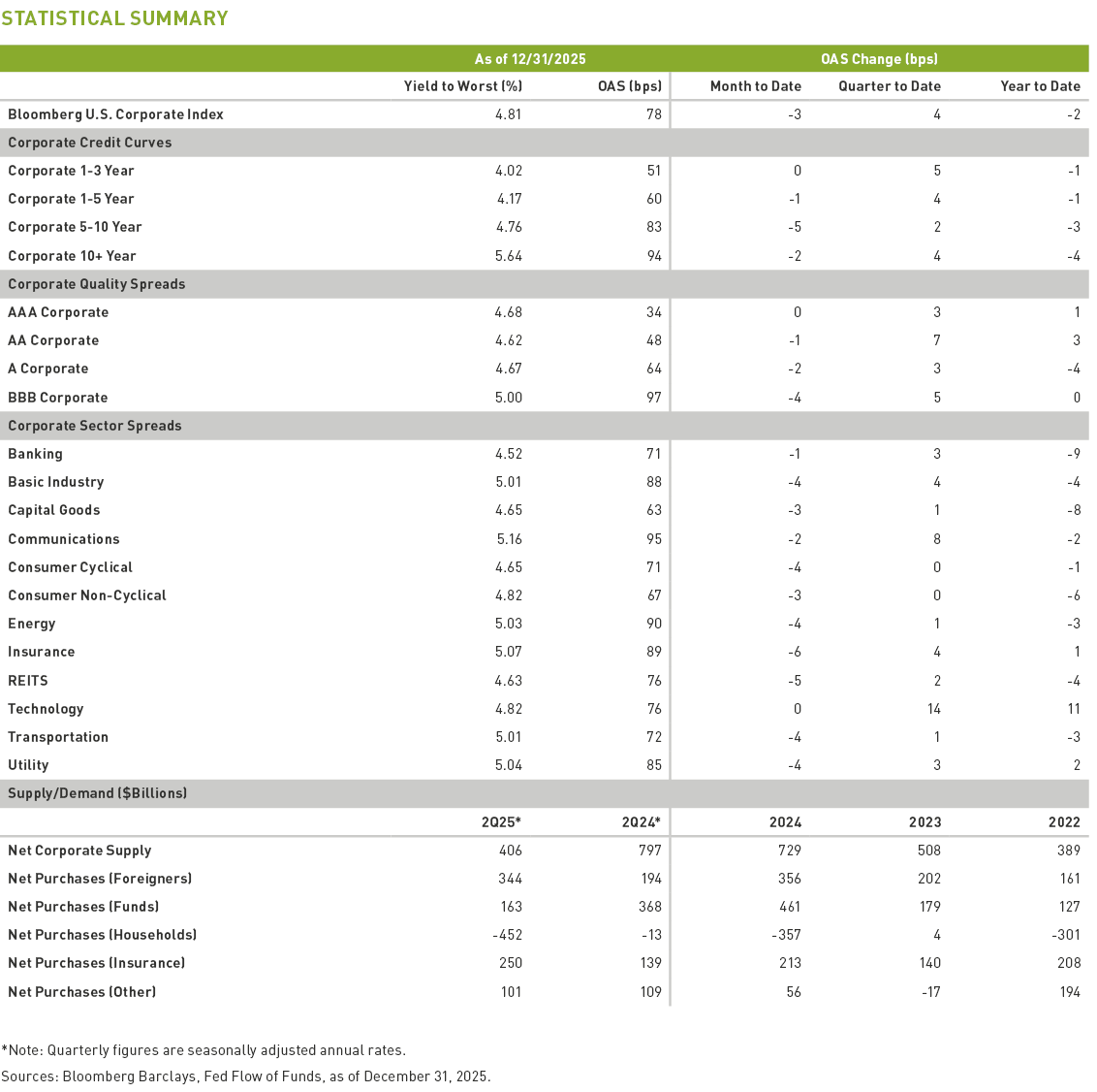 Inflows were nearly half a trillion dollars into taxable bond funds in 2025.7 Foreign investor net corporate bond purchases were one-third of a trillion dollars for the 12 months through October.8 The domestic Insurance sector continues to be a steady source of demand.9 Favorable risk-adjusted performance over the last 12 months may continue to attract steady fund flows into IG corporates. Investor demand will need to remain robust if peak estimates for new issuance come to fruition in 2026. Should markets remain amendable, 2026 gross supply may reach a record at north of $2 trillion.10