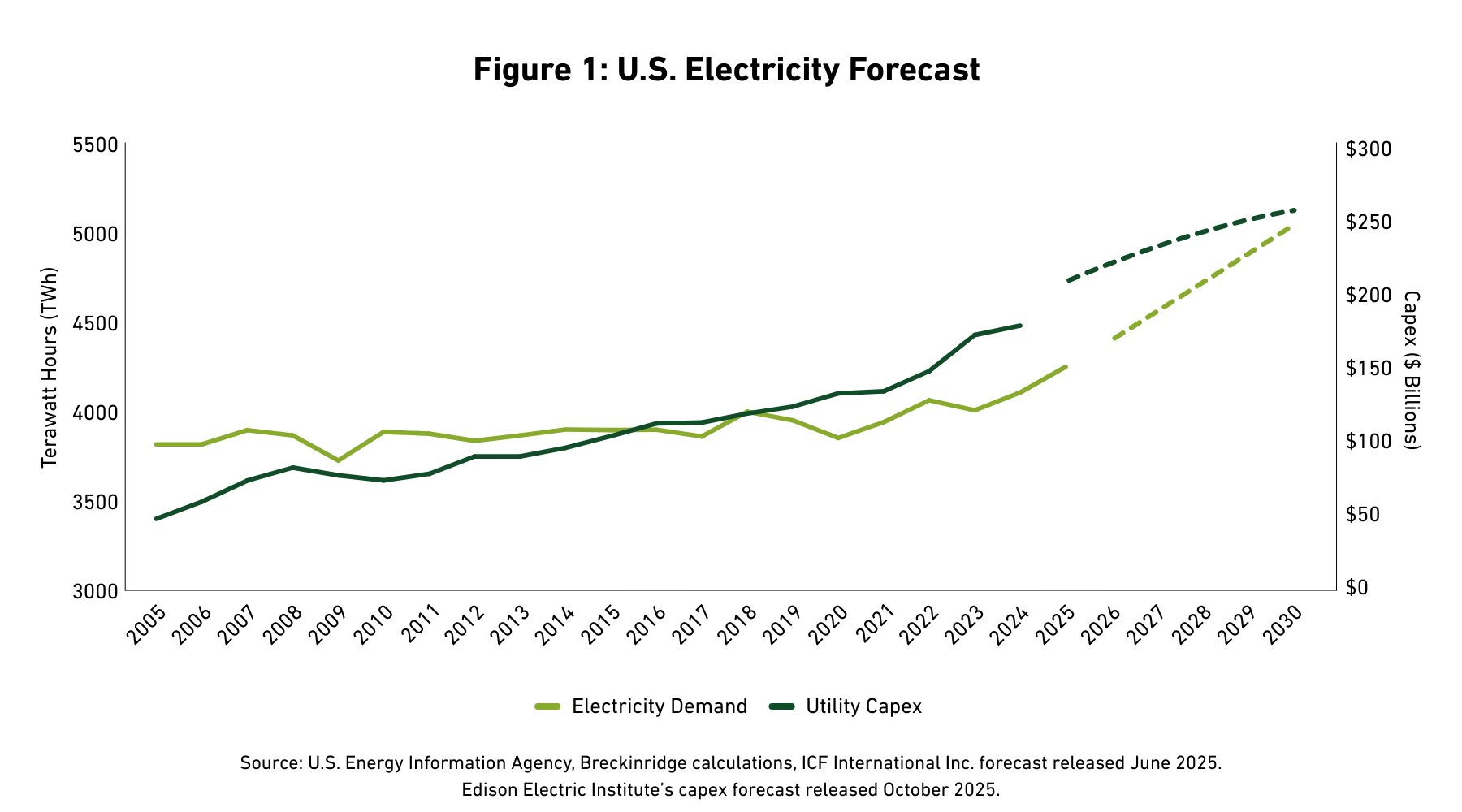 Electric demand flatlined from 2005-2020, with energy efficiency and outsourcing offsetting economic growth. From 2020 to 2024, growth averaged 1.5 percent, entering new stages of electrification such as electric vehicles and industrial processes. More recently, power demand forecasts accelerated with some estimating up to 25 percent growth by 2030, equating to 3 to 4 percent annual growth.1