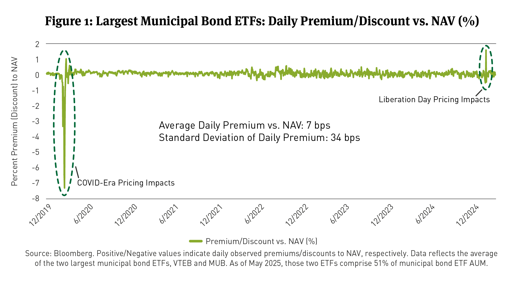 The potential impact of price dislocations during periods of market turmoil is an often-overlooked risk in ETFs. The municipal bond market is highly fragmented and can become relatively illiquid from time to time. Therefore, ETFs can be prone to trading at significant discounts or premiums to their NAV (See Figure 1).