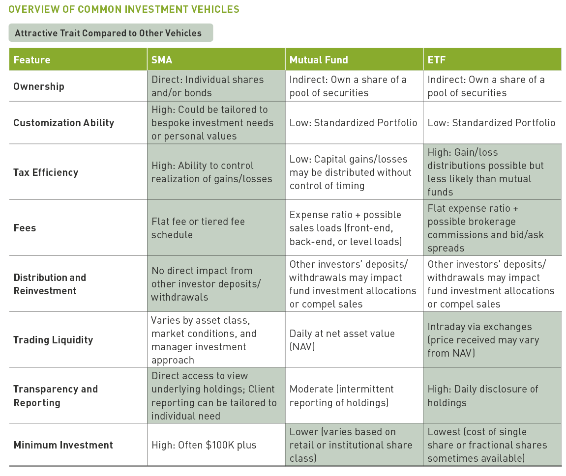 ETFs, by contrast, provide a one-size-fits-most approach, prioritizing broad market exposure and the most liquid issuers, which may or may not closely track a passive index with no room for individualization. This may be seen as adequate for small accounts or those looking for tactical allocations to an asset class, but it may fall short for clients who have more nuanced needs.